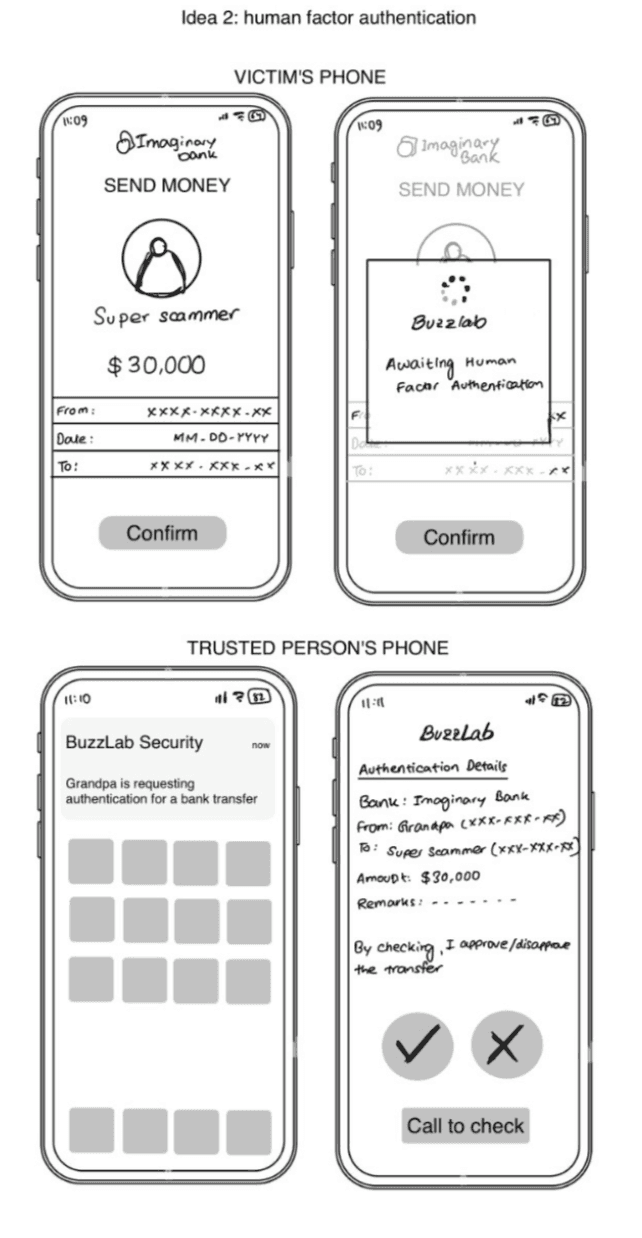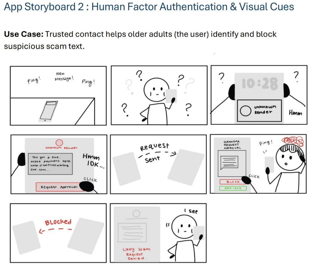 As a team of 3 user researchers + designers, we conducted user research and designed a novel system over 28 weeks that takes harnesses the trust of loved ones to prevent scams.